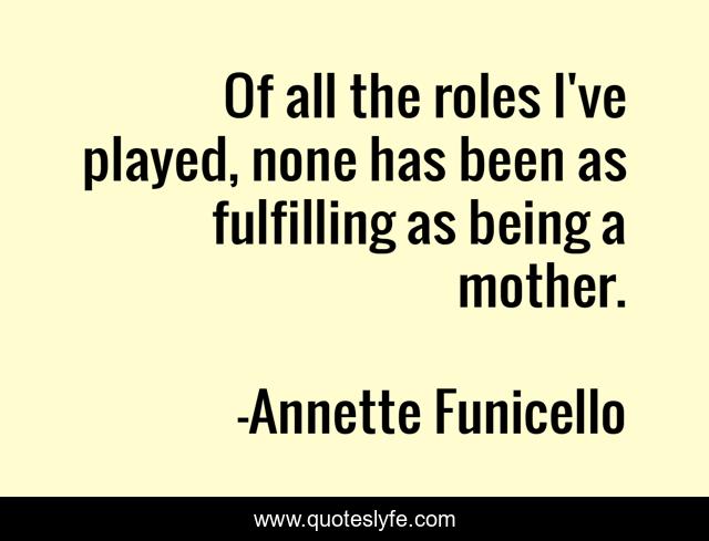 This page presents the quote "Of all the roles I've played, none has been as fulfilling as being a mother.". Author of this quote is Annette Funicello. This quote is about being, none, mother,.