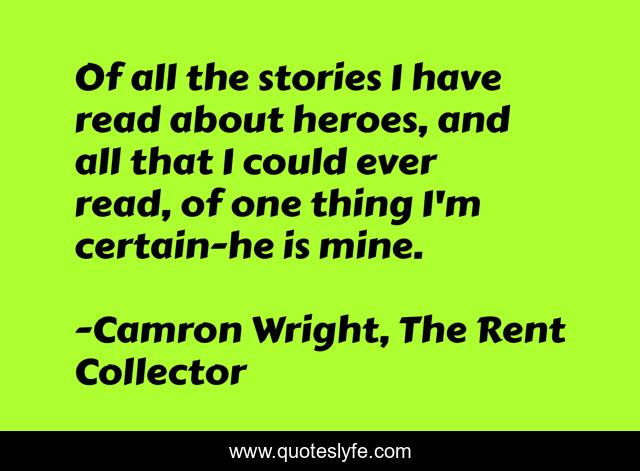 This page presents the quote "Of all the stories I have read about heroes, and all that I could ever read, of one thing I'm certain-he is mine.". Author of this quote is Camron Wright, The Rent Collector. This quote is about heroes, love, affection,.