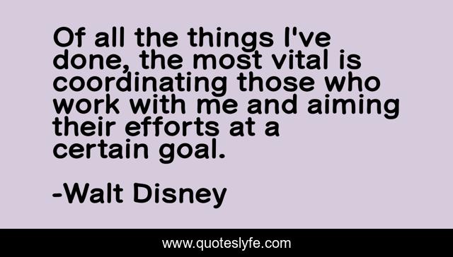 This page presents the quote "Of all the things I've done, the most vital is coordinating those who work with me and aiming their efforts at a certain goal.". Author of this quote is Walt Disney. This quote is about me, done, goal,.