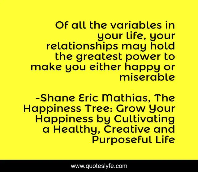 This page presents the quote "Of all the variables in your life, your relationships may hold the greatest power to make you either happy or miserable". Author of this quote is Shane Eric Mathias, The Happiness Tree: Grow Your Happiness by Cultivating a Healthy, Creative and Purposeful Life. This quote is about relationships, joy, harmony, balance, humanity, happiness,.