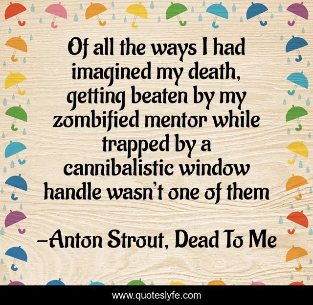 This page presents the quote "Of all the ways I had imagined my death, getting beaten by my zombified mentor while trapped by a cannibalistic window handle wasn’t one of them". Author of this quote is Anton Strout, Dead To Me. This quote is about death, trapped,.