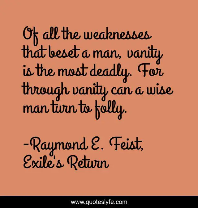 This page presents the quote "Of all the weaknesses that beset a man, vanity is the most deadly. For through vanity can a wise man turn to folly.". Author of this quote is Raymond E. Feist, Exile's Return. This quote is about virtues-and-vices, vanity,.