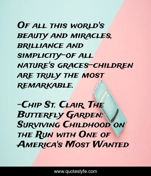 This page presents the quote "Of all this world's beauty and miracles, brilliance and simplicity-of all nature's graces-children are truly the most remarkable.". Author of this quote is Chip St. Clair, The Butterfly Garden: Surviving Childhood on the Run with One of America's Most Wanted. This quote is about positive, confidence, motivational, optimistic,.
