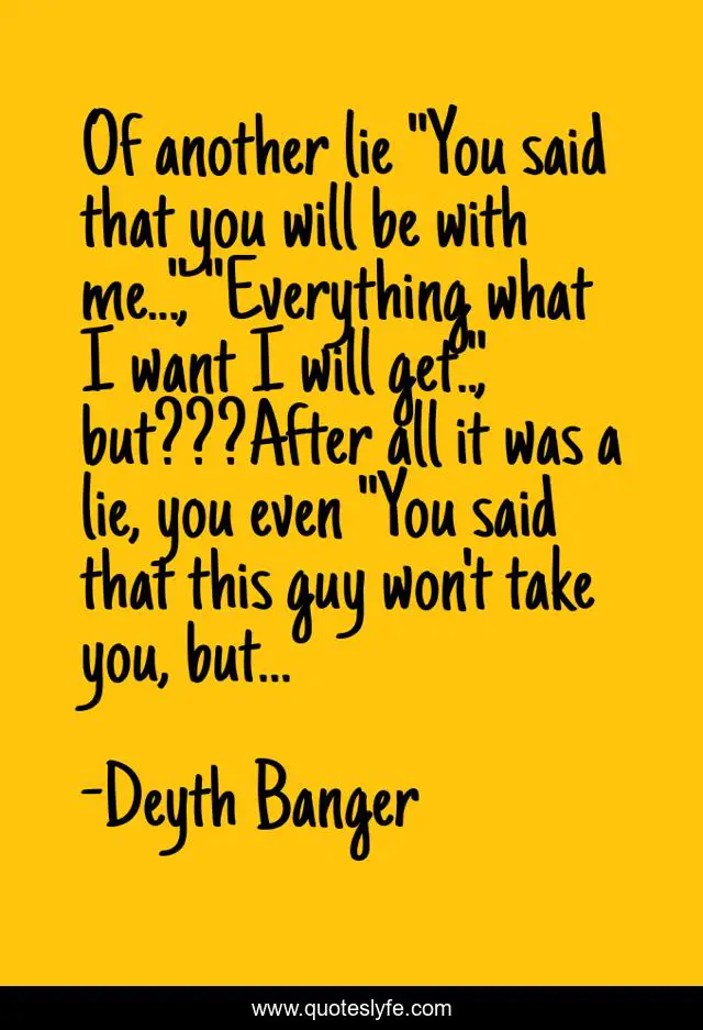 This page presents the quote "Of another lie "You said that you will be with me...", "Everything what I want I will get..", but???After all it was a lie, you even "You said that this guy won't take you, but...". Author of this quote is Deyth Banger. This quote is about lie, said, another, lies,.