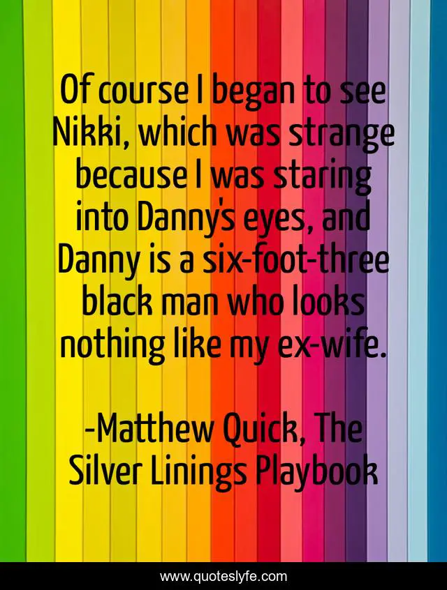 This page presents the quote "Of course I began to see Nikki, which was strange because I was staring into Danny's eyes, and Danny is a six-foot-three black man who looks nothing like my ex-wife.". Author of this quote is Matthew Quick, The Silver Linings Playbook. This quote is about therapy, depression, humour,.