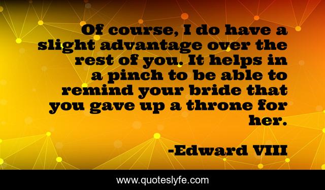 This page presents the quote "Of course, I do have a slight advantage over the rest of you. It helps in a pinch to be able to remind your bride that you gave up a throne for her.". Author of this quote is Edward VIII. This quote is about bride, rest,.