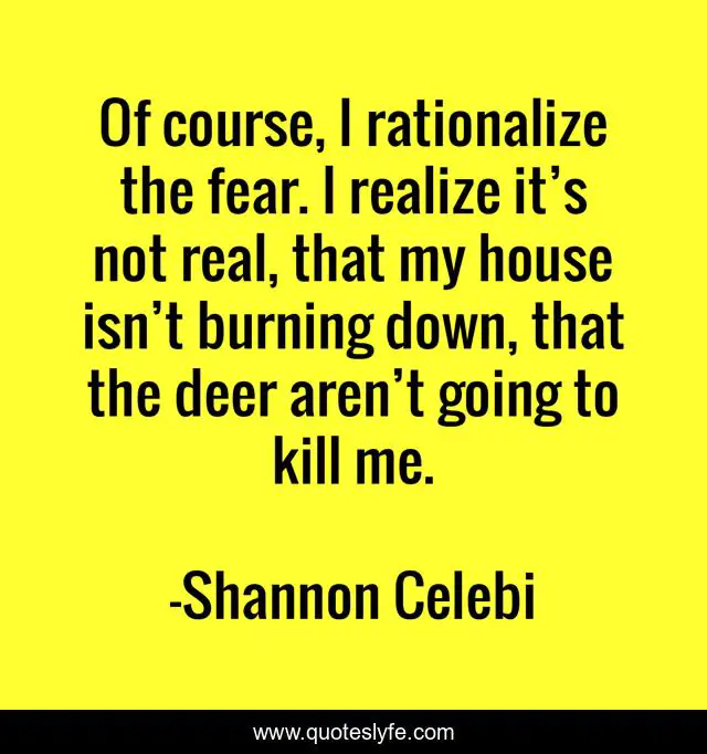 This page presents the quote "Of course, I rationalize the fear. I realize it’s not real, that my house isn’t burning down, that the deer aren’t going to kill me.". Author of this quote is Shannon Celebi. This quote is about anxiety, burning-house, rationality, animal, rationalism, fear, gad, afraid,.