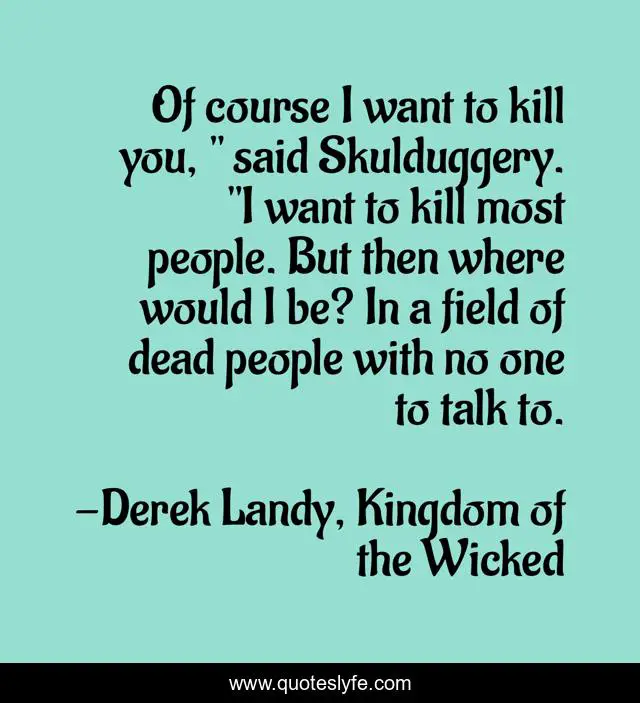 This page presents the quote "Of course I want to kill you, " said Skulduggery. "I want to kill most people. But then where would I be? In a field of dead people with no one to talk to.". Author of this quote is Derek Landy, Kingdom of the Wicked. This quote is about dialogue, death, skulduggery-pleasant, humour, dead, field, nobody-to-talk-to,.