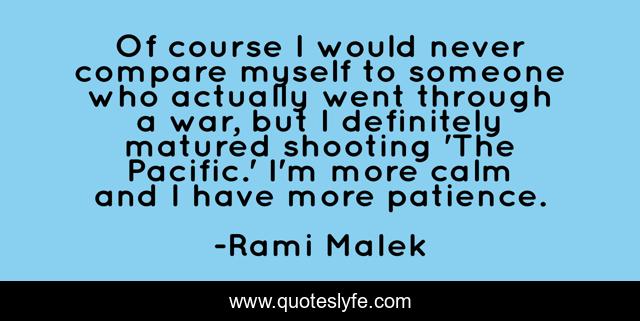 This page presents the quote "Of course I would never compare myself to someone who actually went through a war, but I definitely matured shooting 'The Pacific.' I'm more calm and I have more patience.". Author of this quote is Rami Malek. This quote is about myself, war, calm,.