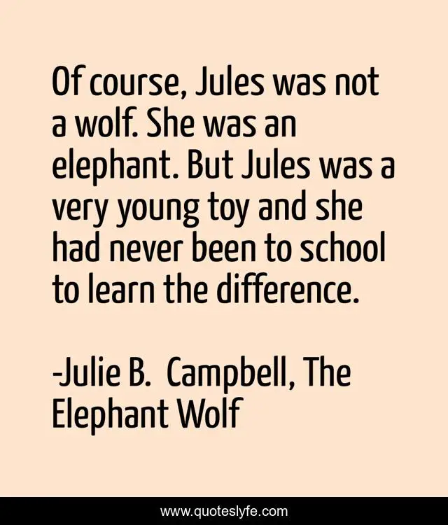 This page presents the quote "Of course, Jules was not a wolf. She was an elephant. But Jules was a very young toy and she had never been to school to learn the difference.". Author of this quote is Julie B. Campbell, The Elephant Wolf. This quote is about cute, comedy, funny,.