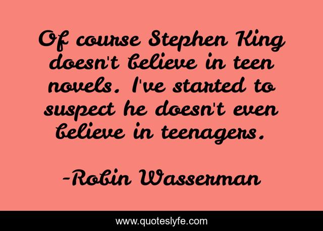 This page presents the quote "Of course Stephen King doesn't believe in teen novels. I've started to suspect he doesn't even believe in teenagers.". Author of this quote is Robin Wasserman. This quote is about king, believe, teenagers,.
