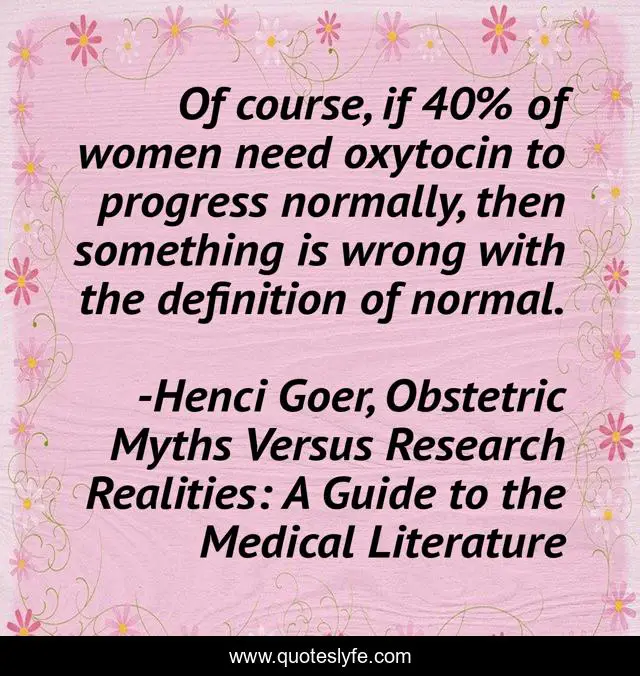 This page presents the quote "Of course, if 40% of women need oxytocin to progress normally, then something is wrong with the definition of normal.". Author of this quote is Henci Goer, Obstetric Myths Versus Research Realities: A Guide to the Medical Literature. This quote is about statistics, humor, birth, doctor,.