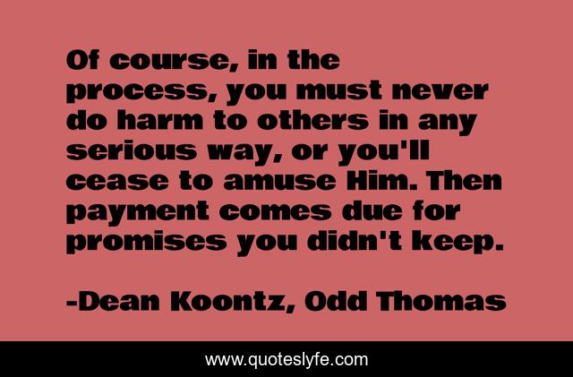 This page presents the quote "Of course, in the process, you must never do harm to others in any serious way, or you'll cease to amuse Him. Then payment comes due for promises you didn't keep.". Author of this quote is Dean Koontz, Odd Thomas. This quote is about god, payment, due, serious-harm,.