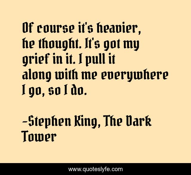 This page presents the quote "Of course it's heavier, he thought. It's got my grief in it. I pull it along with me everywhere I go, so I do.". Author of this quote is Stephen King, The Dark Tower. This quote is about grief, dark-tower, roland,.