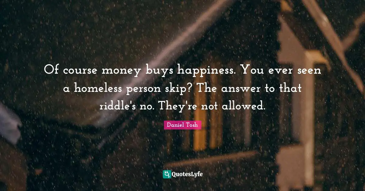 This page presents the quote "Of course money buys happiness. You ever seen a homeless person skip? The answer to that riddle's no. They're not allowed.". Author of this quote is Daniel Tosh. This quote is about skip, riddle, homeless, answers, money, happiness,.