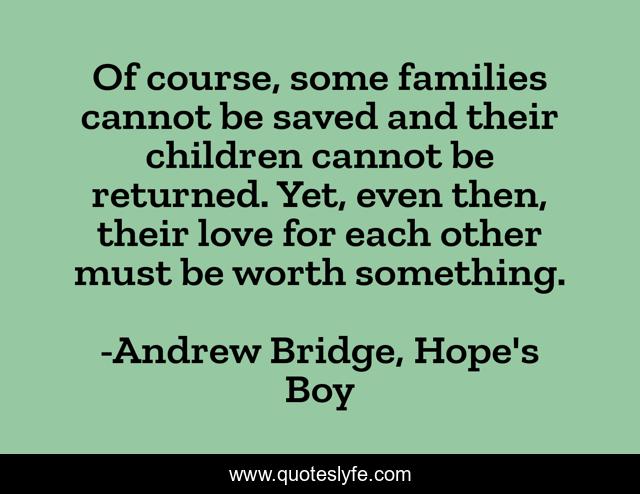 This page presents the quote "Of course, some families cannot be saved and their children cannot be returned. Yet, even then, their love for each other must be worth something.". Author of this quote is Andrew Bridge, Hope's Boy. This quote is about love, parents, affection, inspiration,.