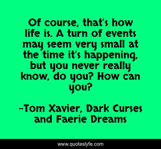 This page presents the quote "Of course, that’s how life is. A turn of events may seem very small at the time it’s happening, but you never really know, do you? How can you?". Author of this quote is Tom Xavier, Dark Curses and Faerie Dreams. This quote is about novel, fantasy, ya, kidlit, future, serendipity,.