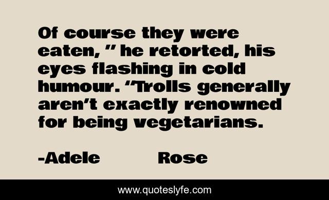 This page presents the quote "Of course they were eaten, ” he retorted, his eyes flashing in cold humour. “Trolls generally aren’t exactly renowned for being vegetarians.". Author of this quote is Adele Rose. This quote is about funny, reading, alex, humour, books, blaine, vegetarians, comedy, young-adult-fantasy,.