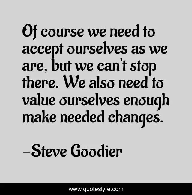 This page presents the quote "Of course we need to accept ourselves as we are, but we can't stop there. We also need to value ourselves enough make needed changes.". Author of this quote is Steve Goodier. This quote is about self-love, nonjudgemental, self-growth, non-judgmental, changing-your-life, understanding, self-improvement, self-acceptance, change,.
