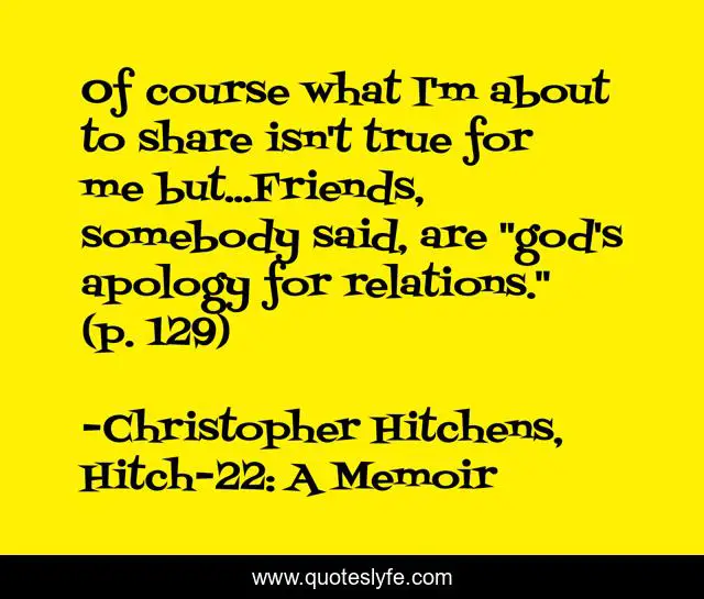 This page presents the quote "Of course what I'm about to share isn't true for me but...Friends, somebody said, are "god's apology for relations." (p. 129)". Author of this quote is Christopher Hitchens, Hitch-22: A Memoir. This quote is about atheism, death, friends, family,.