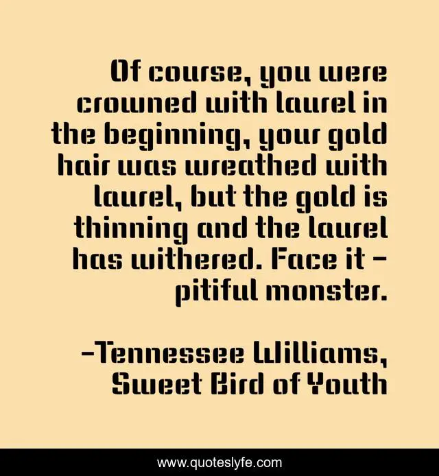 This page presents the quote "Of course, you were crowned with laurel in the beginning, your gold hair was wreathed with laurel, but the gold is thinning and the laurel has withered. Face it – pitiful monster.". Author of this quote is Tennessee Williams, Sweet Bird of Youth. This quote is about aging, life, laurels, age, hair, laurel, youth,.
