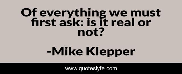This page presents the quote "Of everything we must first ask: is it real or not?". Author of this quote is Mike Klepper. This quote is about question-everything, questioning, nonexistence, reality, existence,.