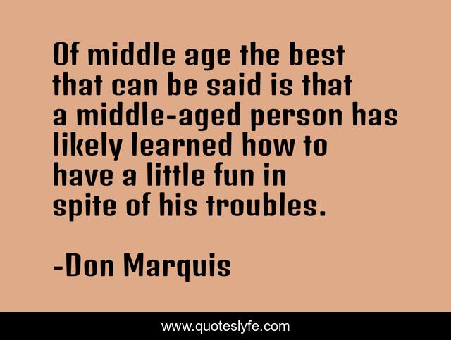 This page presents the quote "Of middle age the best that can be said is that a middle-aged person has likely learned how to have a little fun in spite of his troubles.". Author of this quote is Don Marquis. This quote is about fun, said, best,.