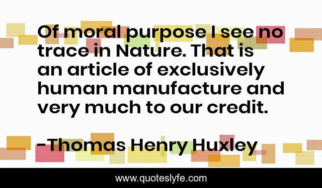 This page presents the quote "Of moral purpose I see no trace in Nature. That is an article of exclusively human manufacture and very much to our credit.". Author of this quote is Thomas Henry Huxley. .