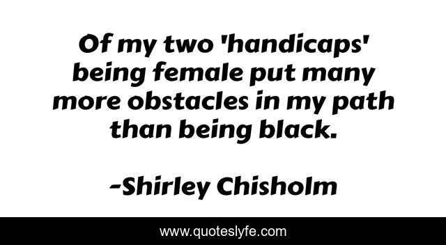 This page presents the quote "Of my two 'handicaps' being female put many more obstacles in my path than being black.". Author of this quote is Shirley Chisholm. .