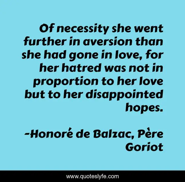 This page presents the quote "Of necessity she went further in aversion than she had gone in love, for her hatred was not in proportion to her love but to her disappointed hopes.". Author of this quote is Honoré de Balzac, Père Goriot. This quote is about hopelessnes, love, hope, affection, emotions,.