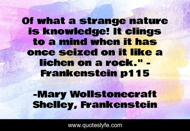 This page presents the quote "Of what a strange nature is knowledge! It clings to a mind when it has once seized on it like a lichen on a rock." - Frankenstein p115". Author of this quote is Mary Wollstonecraft Shelley, Frankenstein. This quote is about leadership, knowledge, learning,.