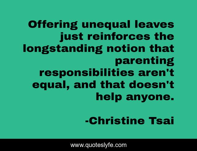This page presents the quote "Offering unequal leaves just reinforces the longstanding notion that parenting responsibilities aren't equal, and that doesn't help anyone.". Author of this quote is Christine Tsai. This quote is about help, just, equal,.