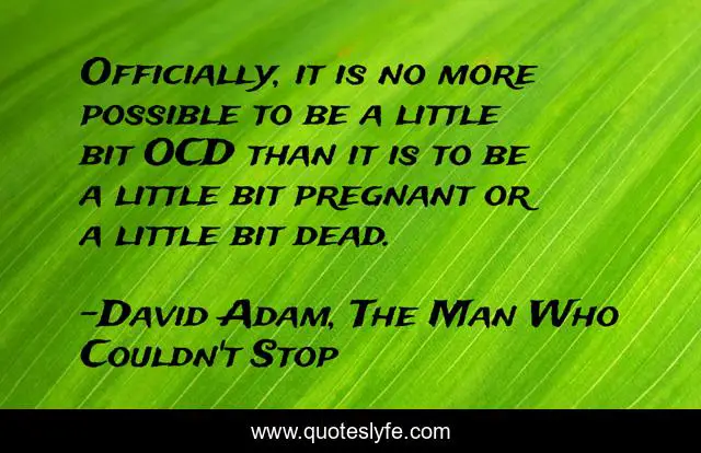 This page presents the quote "Officially, it is no more possible to be a little bit OCD than it is to be a little bit pregnant or a little bit dead.". Author of this quote is David Adam, The Man Who Couldn't Stop. This quote is about mental-health-stigma, mental-health, ocd, truth,.