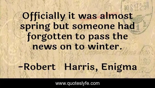 This page presents the quote "Officially it was almost spring but someone had forgotten to pass the news on to winter.". Author of this quote is Robert Harris, Enigma. This quote is about spring, winter,.