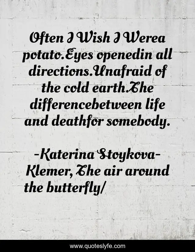 "Katerina Stoykova-Klemer, The air around the butterfly/Въздухът около пеперудата Quotes." Quoteslyfe.com, 2025. Sat. 06 Dec. 2025. <https://www.quoteslyfe.com/quote/Often-I-Wish-I-Werea-potato-Eyes-158406>.