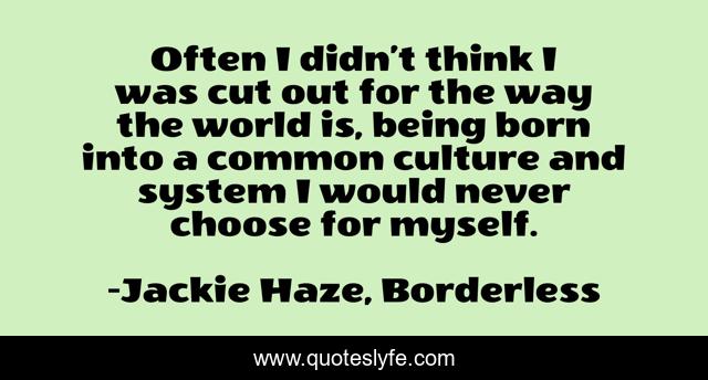 This page presents the quote "Often I didn’t think I was cut out for the way the world is, being born into a common culture and system I would never choose for myself.". Author of this quote is Jackie Haze, Borderless. This quote is about life, unconventional, society, free-spirit, system, culture, status-quo, convention,.