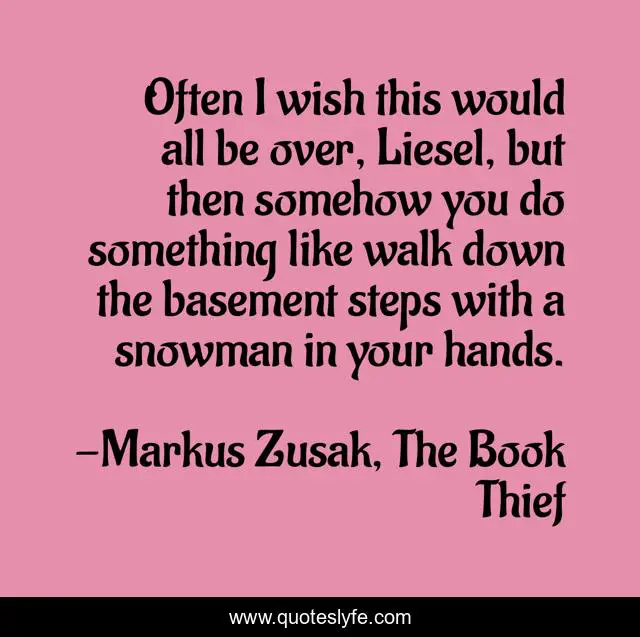 This page presents the quote "Often I wish this would all be over, Liesel, but then somehow you do something like walk down the basement steps with a snowman in your hands.". Author of this quote is Markus Zusak, The Book Thief. .