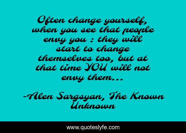 This page presents the quote "Often change yourself, when you see that people envy you : they will start to change themselves too, but at that time YOU will not envy them...". Author of this quote is Alen Sargsyan, The Known Unknown. This quote is about envy, people,.