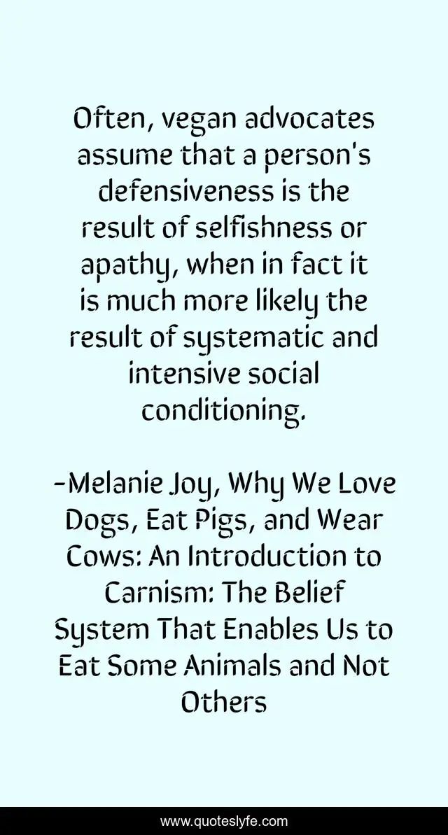 "Melanie Joy, Why We Love Dogs, Eat Pigs, and Wear Cows: An Introduction to Carnism: The Belief System That Enables Us to Eat Some Animals and Not Others Quotes." Quoteslyfe.com, 2025. Mon. 08 Dec. 2025. <https://www.quoteslyfe.com/quote/Often-vegan-advocates-assume-that-a-person-207270>.