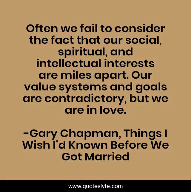 This page presents the quote "Often we fail to consider the fact that our social, spiritual, and intellectual interests are miles apart. Our value systems and goals are contradictory, but we are in love.". Author of this quote is Gary Chapman, Things I Wish I'd Known Before We Got Married. This quote is about falling-in-love, love, failure-relationship, relationship, successful-marriage, marriage, short-term-feeling, affection,.