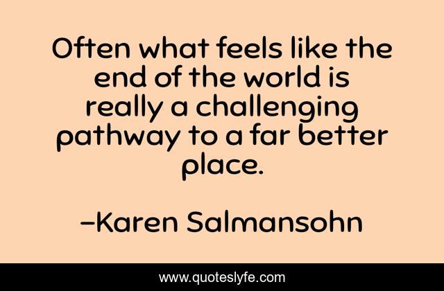 This page presents the quote "Often what feels like the end of the world is really a challenging pathway to a far better place.". Author of this quote is Karen Salmansohn. This quote is about faith, strength-through-adversity, paths-of-life, challenges, courage, path, hope,.