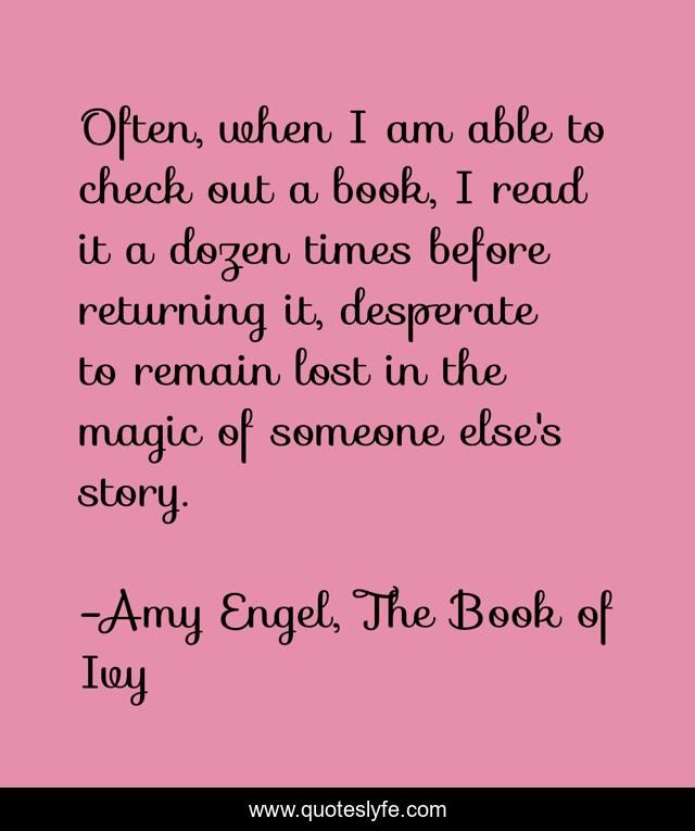 This page presents the quote "Often, when I am able to check out a book, I read it a dozen times before returning it, desperate to remain lost in the magic of someone else's story.". Author of this quote is Amy Engel, The Book of Ivy. This quote is about magic, the-book-of-ivy, bookworm, fiction, amy-engel, books, stories, escape, reading,.