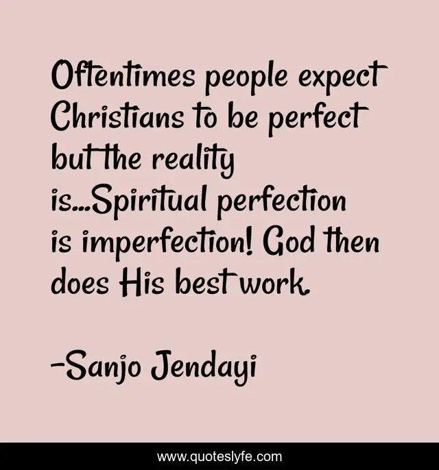 This page presents the quote "Oftentimes people expect Christians to be perfect but the reality is...Spiritual perfection is imperfection! God then does His best work.". Author of this quote is Sanjo Jendayi. This quote is about perfect, spiritual, christian, god, imperfection, perfection, deserie-johnson, sanjo-jendayi,.