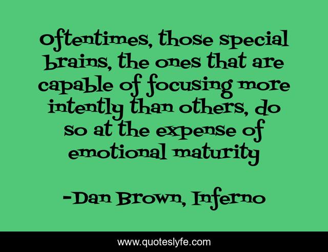 This page presents the quote "Oftentimes, those special brains, the ones that are capable of focusing more intently than others, do so at the expense of emotional maturity". Author of this quote is Dan Brown, Inferno. This quote is about brain, neuroscience,.