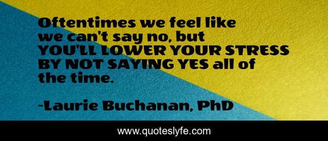 This page presents the quote "Oftentimes we feel like we can't say no, but YOU'LL LOWER YOUR STRESS BY NOT SAYING YES all of the time.". Author of this quote is Laurie Buchanan, PhD. This quote is about stress-management, stress, just-say-no,.