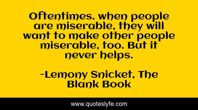 This page presents the quote "Oftentimes. when people are miserable, they will want to make other people miserable, too. But it never helps.". Author of this quote is Lemony Snicket, The Blank Book. .