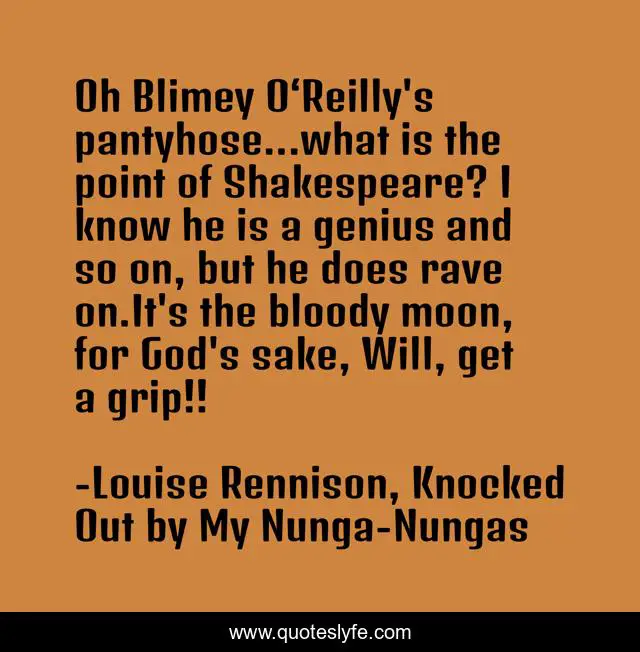 This page presents the quote "Oh Blimey O‘Reilly's pantyhose...what is the point of Shakespeare? I know he is a genius and so on, but he does rave on.It's the bloody moon, for God's sake, Will, get a grip!!". Author of this quote is Louise Rennison, Knocked Out by My Nunga-Nungas. .