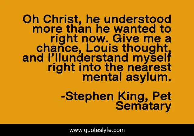 This page presents the quote "Oh Christ, he understood more than he wanted to right now. Give me a chance, Louis thought, and I’llunderstand myself right into the nearest mental asylum.". Author of this quote is Stephen King, Pet Sematary. This quote is about crazy, insanity, mental, understanding,.