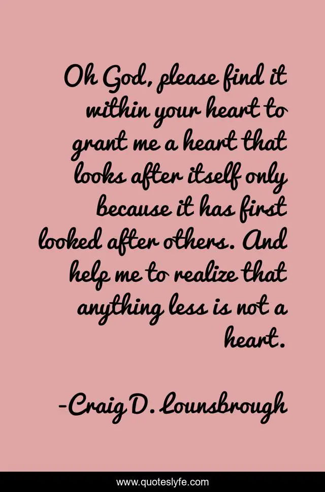 This page presents the quote "Oh God, please find it within your heart to grant me a heart that looks after itself only because it has first looked after others. And help me to realize that anything less is not a heart.". Author of this quote is Craig D. Lounsbrough. This quote is about heart, sacrificial, selfish, giving, god, sacrifice, care-giving, selfless, care,.
