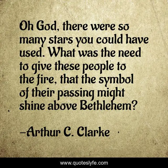 This page presents the quote "Oh God, there were so many stars you could have used. What was the need to give these people to the fire, that the symbol of their passing might shine above Bethlehem?". Author of this quote is Arthur C. Clarke. This quote is about death-star, science-fiction, god,.